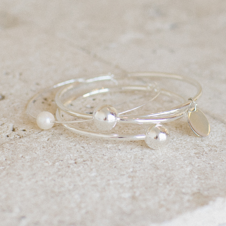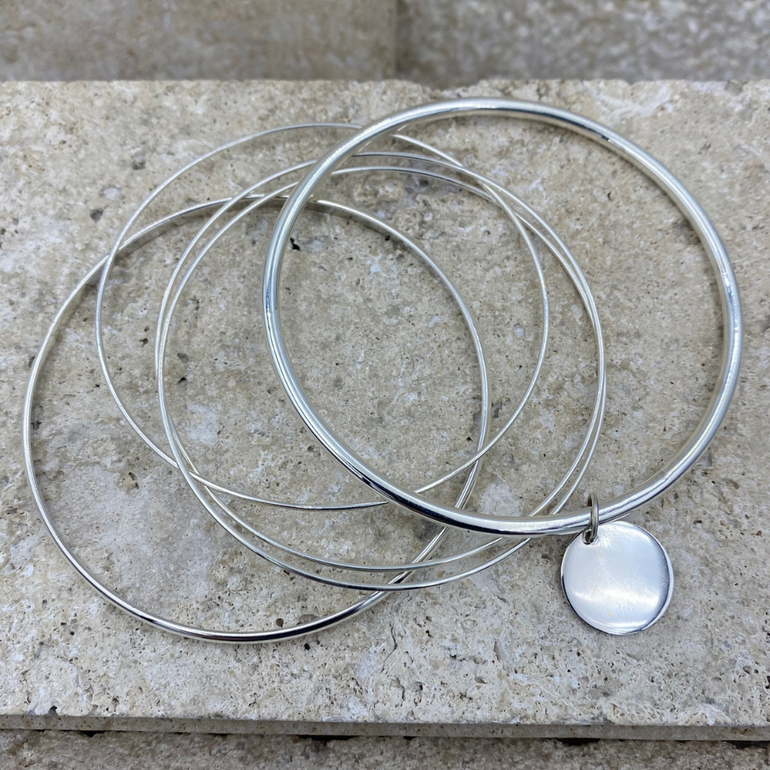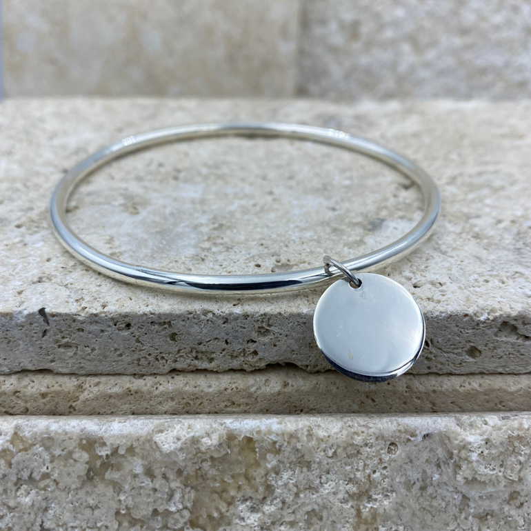925 Sterling Silver Round Bangle with round disc charm (engravable). Disc size 15mm diameter.