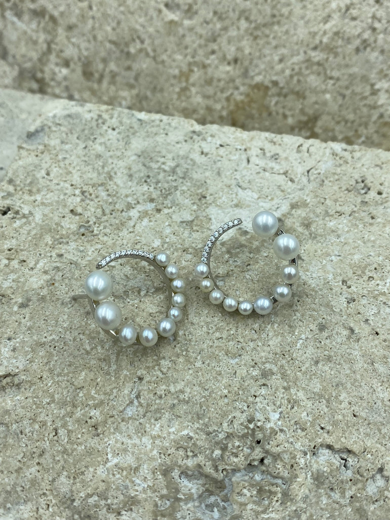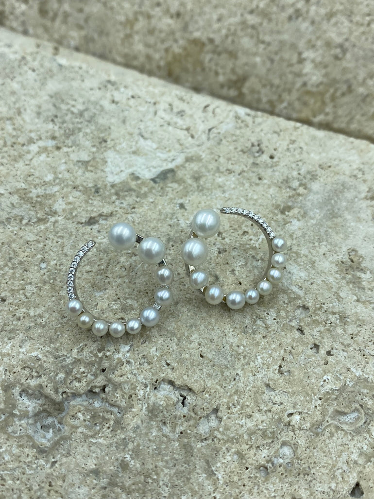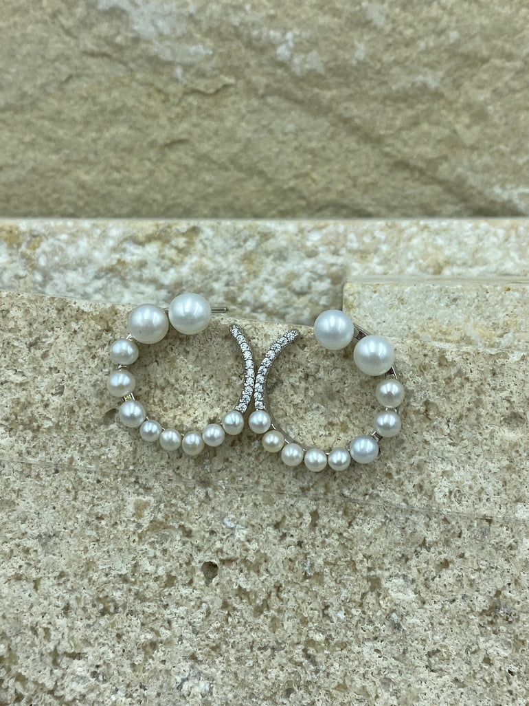 925 Sterling Silver, Natural Freshwater Pearl & Cubic Zirconia Earrings. Circle diameter 2cm.