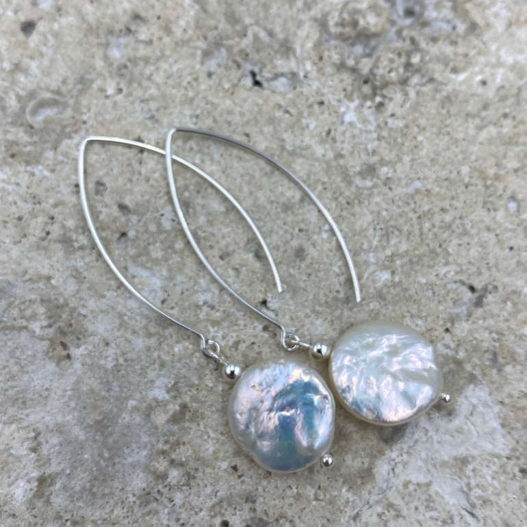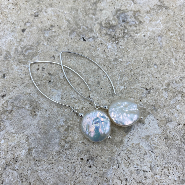 925 Sterling Silver & Natural Freshwater Coin Pearl Dangle Drop Earrings. Drop top to bottom 5.2cm & pearl 13mm in diameter.