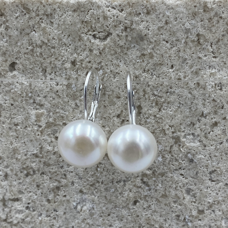 925 Sterling Silver & Natural Freshwater Pearl Leverback Earrings. Drop top to bottom 19mm & pearl 10mm in diameter.