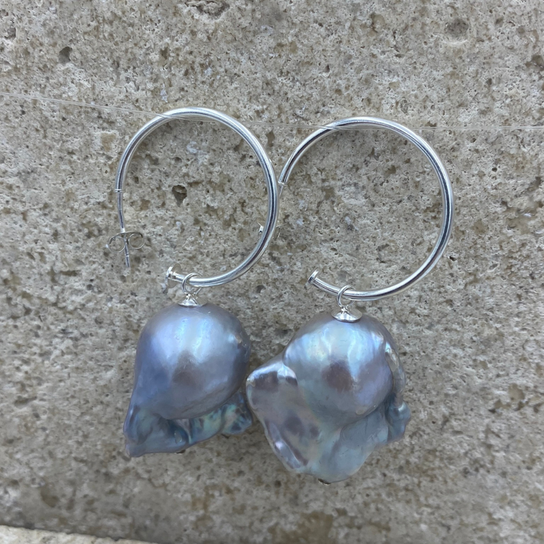 925 Sterling Silver & Natural Freshwater Baroque Pearl Earrings. Hoop 2.5cm diameter & pearl 2.7cm top to bottom.
