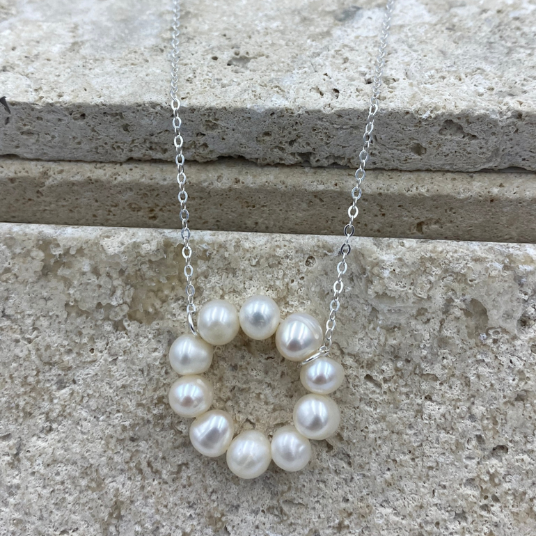 Circular White Pearl & Silver Chain Necklace