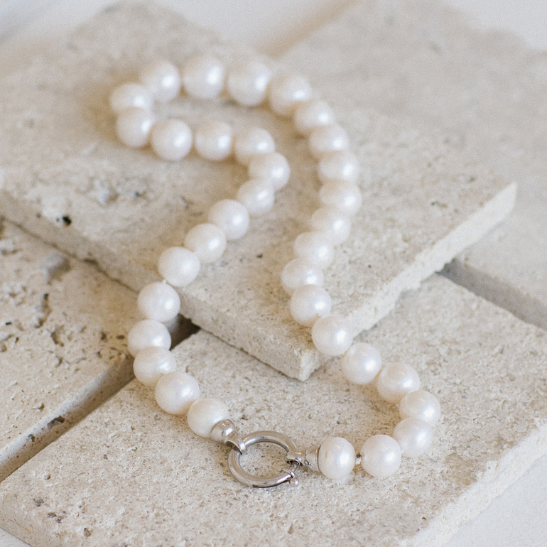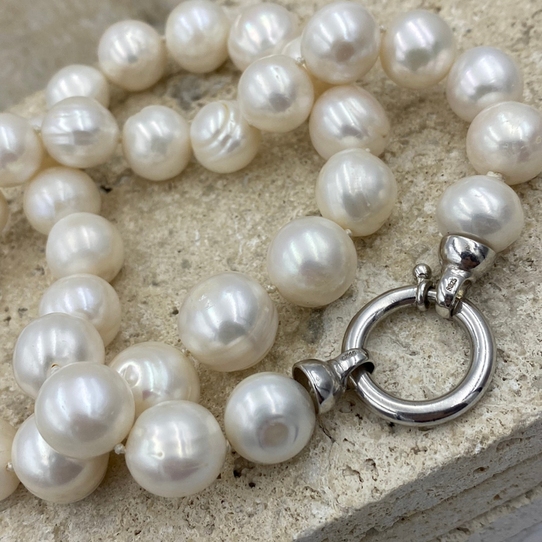 Natural Freshwater Pearl Strand with 925 Sterling Silver Signoretti clasp. High lustre & quality. Length 45cm excl clasp, 47cm incl clasp. 12/13mm pearls.
