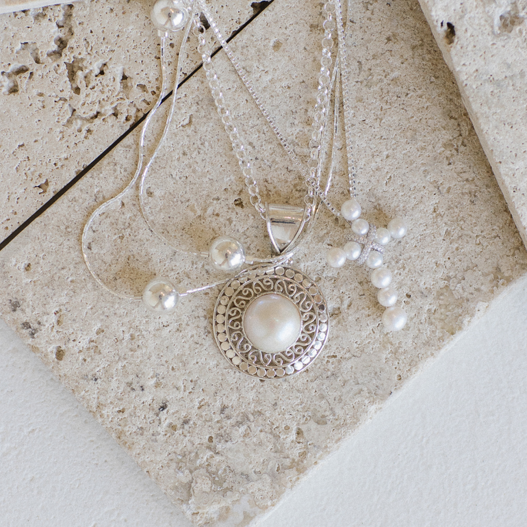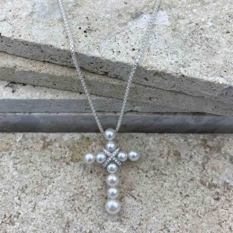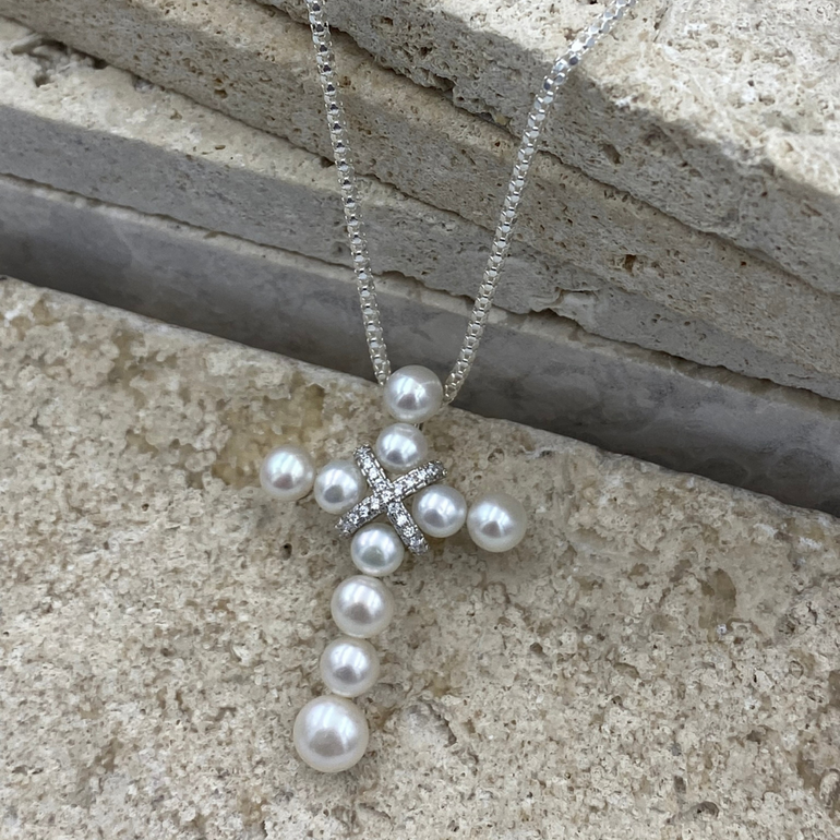 925 Sterling Silver, Cubic Zirconia & Natural Freshwater Pearls Pendant. Cross 3.7cm from top to bottom with a 45cm chain.