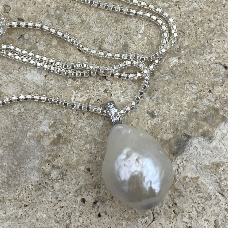 Natural Freshwater Baroque Pearl Pendant in 925 Sterling Silver & Cubic Zirconia stones on a Sterling Silver chain. 42cm chain.